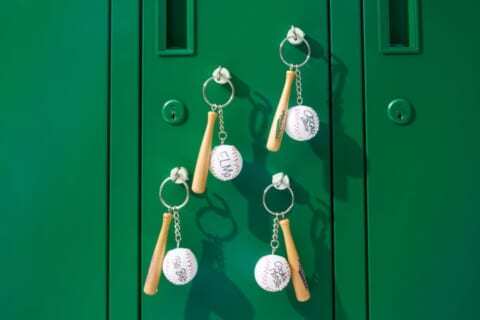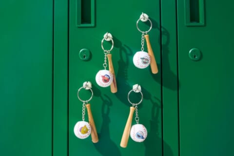 ベースボールキャップをかぶったキャラクターたちのイラストをあしらった、野球グッズモチーフのキーホルダーです。ボールの裏面にはキャラクターたちのサインが、バット部分にはセサミストリートマーケットオリジナルのチームロゴがプリントされており、ユニークなデザインがポイントです。レッド(エルモ)、グリーン(オスカー)、ブルー(クッキーモンスター)、パープル(ビッグバード)の全4色展開です。