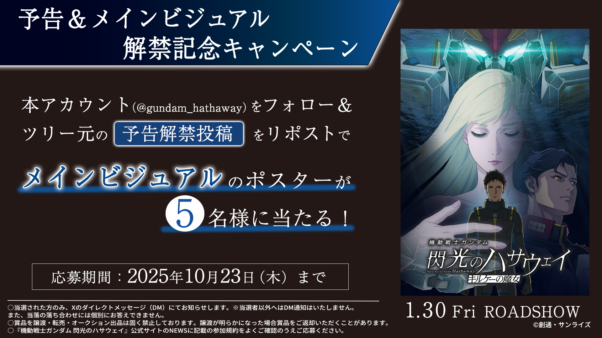 『機動戦士ガンダム 閃光のハサウェイ キルケーの魔女』の劇場公開決定と最新情報解禁を記念し、公式Xにてキャンペーンが開催されています。公式Xアカウントをフォローし、対象の投稿をリポストすることで、抽選で5名様にメインビジュアルのポスターが贈られます。
