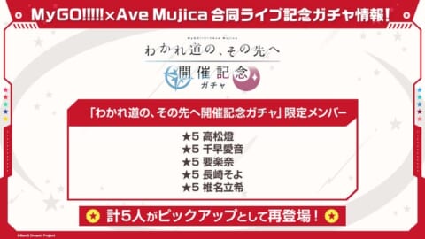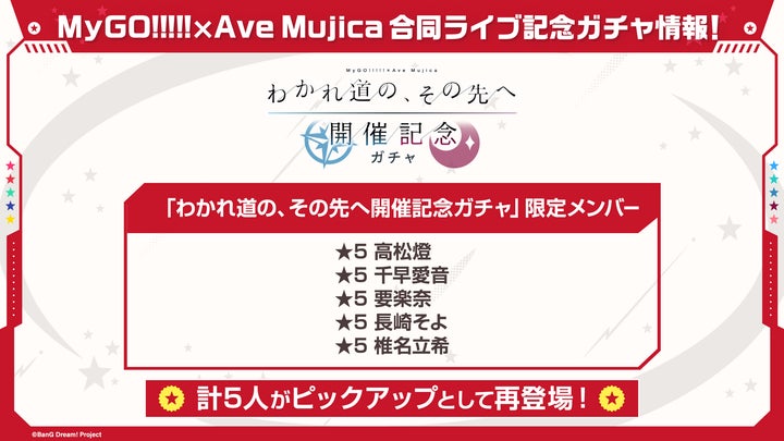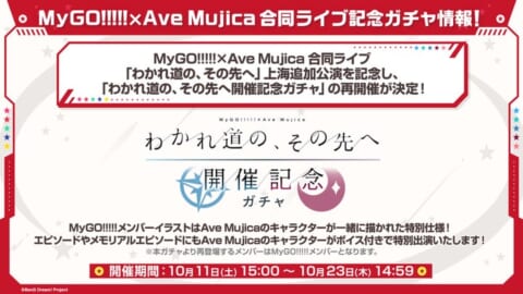 • 内容: MyGO!!!!!×Ave Mujica合同ライブ「わかれ道の、その先へ」上海追加公演を記念したガチャの再開催。MyGO!!!!!メンバーの限定★5イラストが再登場し、Ave Mujicaのキャラクターも特別出演いたします。