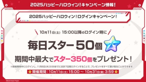 「2025ハッピーハロウィン!ログインキャンペーン!」では、10月11日(土)15:00から10月31日(金)3:59の期間中にログインすることで、毎日「スター50個」が手に入ります。期間中に1回ログインし、11月6日(木)3:59までに合計7日間のログインを達成することで、最大「スター350個」をすべて受け取ることが可能です。