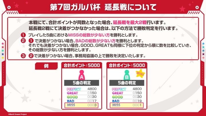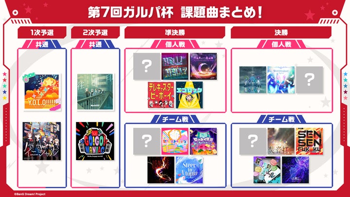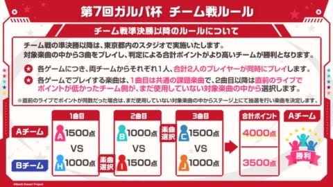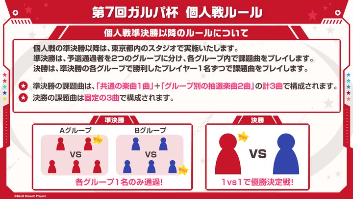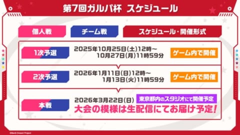 第7回ガルパ杯は、個人戦とチーム戦の両形式で実施されます。オンラインでの予選と、東京都内のスタジオでの本戦から構成される大規模な大会です。