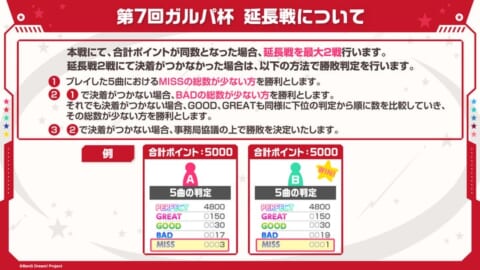 • 合計ポイントが同数の場合は、延長戦を最大2戦行います。それでも決着がつかない場合は、MISSの総数、BADの数の比較など段階的に判定し、最終的に事務局協議の上で勝敗を決定します。