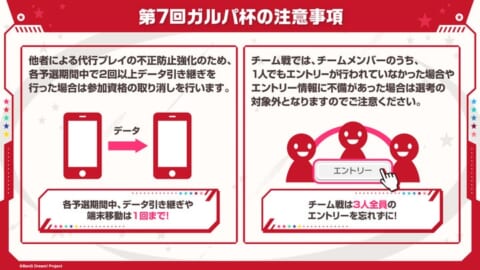 不正対策強化のため、予選期間中に2回以上のデータ引き継ぎを行った場合、参加資格が取り消されます。チーム戦では、チームメンバーのうち1人でもエントリーが行われていなかった場合や、エントリー情報に不備があった場合は選考対象外となるためご注意ください。
