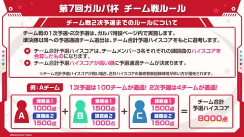 • 予選: 1次予選・2次予選ともに、ガルパ特設ページ内で実施。チームメンバー全員の課題曲のハイスコアが高い順に、1次予選では100チーム、2次予選では4チームが通過し、本戦へ進出します。