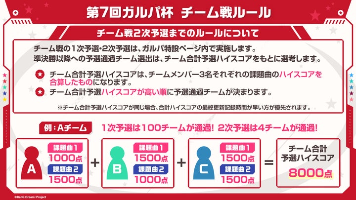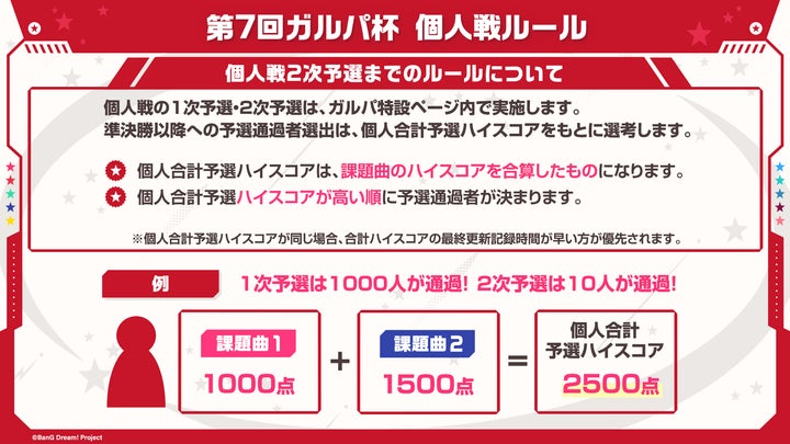 • 予選: 1次予選・2次予選ともに、ガルパ杯特設ページ内で実施されます。2曲のハイスコア合計が高い順に、1次予選では1000人、2次予選では10人が通過し、本戦へ進出します。