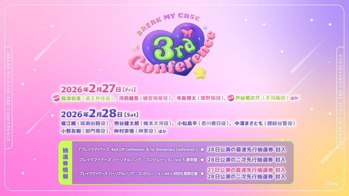 2026年2月27日(金)・28日(土)に開催予定の『ブレイクマイケース 3rd Conference』において、27日公演に須王芦佳役の興津和幸さんと天羽嵐役の戸谷菊之介さんの登壇が決定しました。現在、イベントBlu-ray購入者限定の最速先行申込が受付中です。