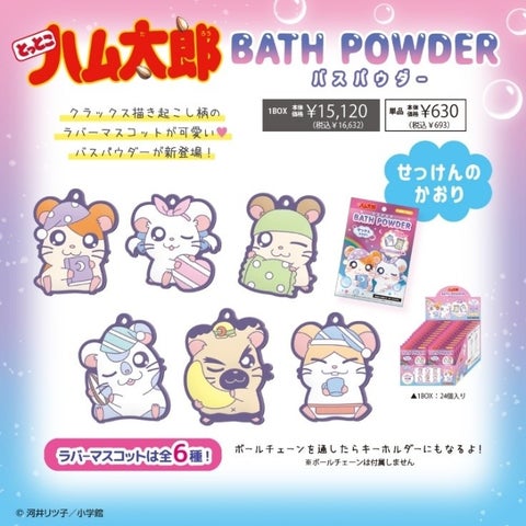- 特徴: ハム太郎のお休み柄で、おふろタイムにおすすめです。可愛いキャラクターのラバーマスコット付きで、ボールチェーンを通すとキーホルダーになります。