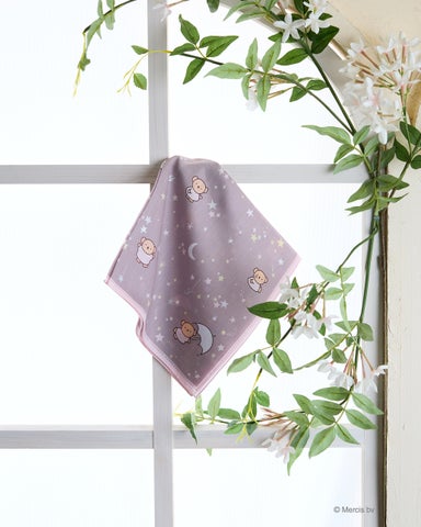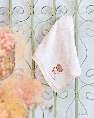 タオルハンカチは、アラベスクモチーフにボリスのアップリケ刺繍が施されたデザインです。裾にはキラキラのラインがアクセントとして加わり、上品さの中に遊び心を感じさせます。日常使いはもちろん、プレゼントとしても喜ばれるアイテムです。