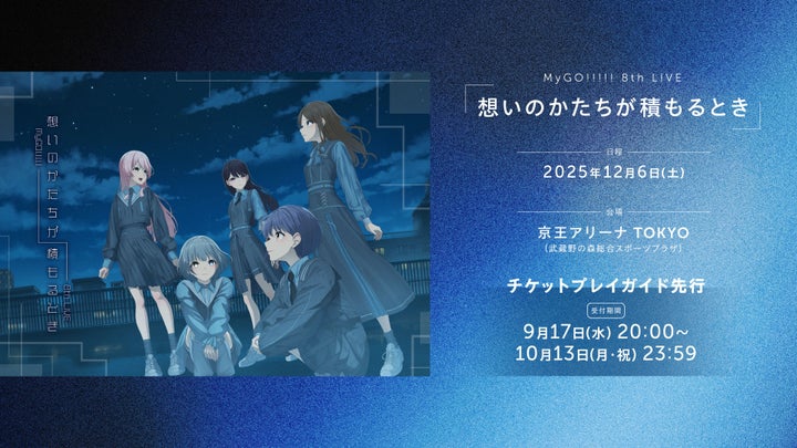 MyGO!!!!! 8th LIVE「想いのかたちが積もるとき」が、2025年12月6日(土)に京王アリーナ TOKYO(武蔵野の森総合スポーツプラザ)にて開催されます。チケットプレイガイド先行が10月13日(月・祝)23:59まで受付中です。