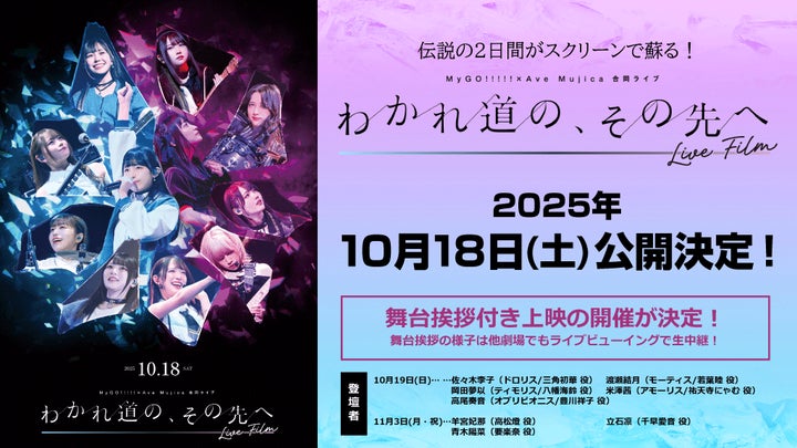 2025年10月18日(土)には、MyGO!!!!!×Ave Mujica 合同ライブ「わかれ道の、その先へ」LIVE FILMが公開されます。今年4月に開催された合同ライブの映像に加え、羊宮妃那(高松燈 役)・高尾奏音(オブリビオニス/豊川祥子 役)が特別出演するオリジナルカットも収録されています。