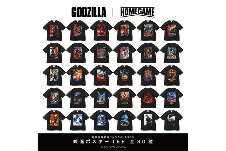 日本の特撮文化を象徴する「ゴジラ」と、ストリートカルチャーを牽引する「HOMEGAME」によるスペシャルコラボレーションTシャツが登場します。邦画ゴジラシリーズ歴代30作品の映画ポスターをモチーフに、そのビジュアルをフロントに大胆にプリントしたアイテムです。