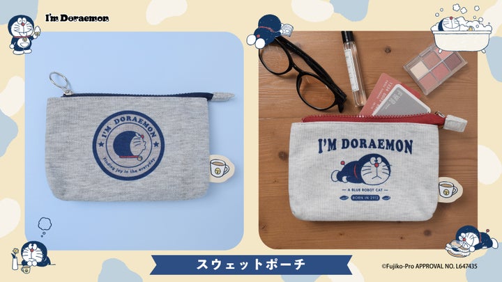 杢目の入ったスウェット生地が使用された、柔らかい風合いのポーチです。3つのポケットを備え、収納力に優れています。マチ付きのため、コスメやお薬などをコンパクトに収納可能。カード、コスメ、お薬、レシートなど、用途に合わせて整理整頓できる便利なアイテムです。寝転がるドラえもんと、横顔デザインの全2種がラインナップされています。