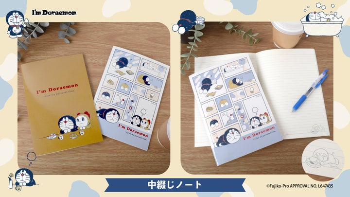 ほど良いサイズ感で持ち運びにも便利なA5サイズの中綴じノートです。6mm罫線、31行の仕様で、実用性も兼ね備えています。表紙にはゆったりと過ごすドラえもんとドラミのデザインが施されており、ページの右下にはワンポイントでドラえもんがプリントされています。PP加工がされているため、汚れにくい点も特徴です。全2種で、ギフトにも適しています。