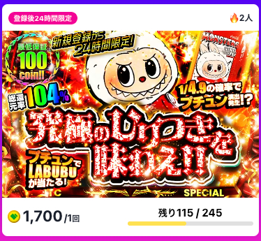また、別の「LABUBUラブリーバブル」ガチャでは「1/77の確率でLABUBUが当たる!!」と案内。
