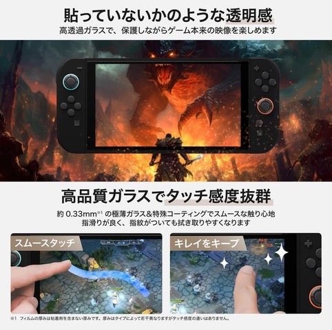 約97.2%のブルーライトをカットするタイプです。目の負担を大幅に軽減し、長時間のゲームプレイでも快適さを維持します。強化ガラス製のため、タッチ操作の感度も損ないません。