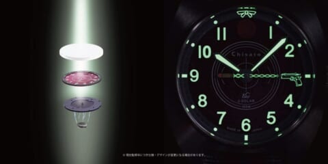 本モデルは、高い実用性だけでなく遊び心も兼ね備えています。秒針が15秒を指すと、3時位置の銃口から放たれる弾丸の軌道が夜光で浮かび上がる特別なギミックを演出。暗闇で光る様子は、作品の世界観をより一層深く感じさせるでしょう。