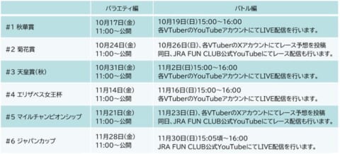 バラエティ編で得た知識を活かし、VTuberたちは「秋華賞」「菊花賞」「天皇賞(秋)」「エリザベス女王杯」「マイルチャンピオンシップ」「ジャパンカップ」の計6つのGⅠレースで競馬予想に挑みます。予想は、各VTuberのYouTubeチャンネルでのLIVE配信(ジャパンカップのみJRA FUN CLUBチャンネル)やXアカウントでの投稿を通じて公開されます。