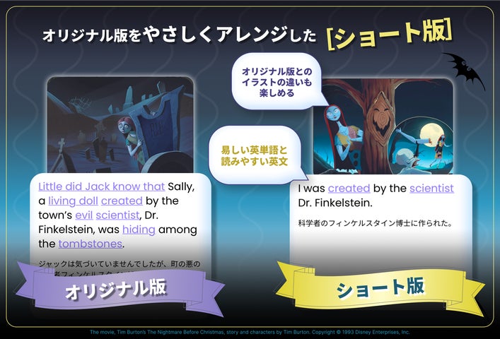 今回の追加により、『ナイトメアー・ビフォア・クリスマス』シリーズは、中上級者向けの[オリジナル版]と、初中級者向けの[ショート版]2作品(ジャック視点、サリー視点)を含む計3作品が収録されました。これにより、ユーザーは自身の英語レベルに応じて学習作品を選択することが可能です。