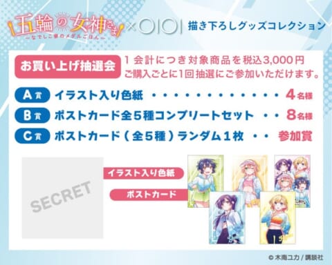 「『五輪の女神さま』×OIOI 描き下ろしグッズコレクション」の商品を税込3,000円ご購入ごとに1回、ハズレなしの抽選会にご参加いただけます。ここでしか手に入らない木南ユカ先生イラスト色紙や、描き下ろしポストカードが当たるチャンスです。