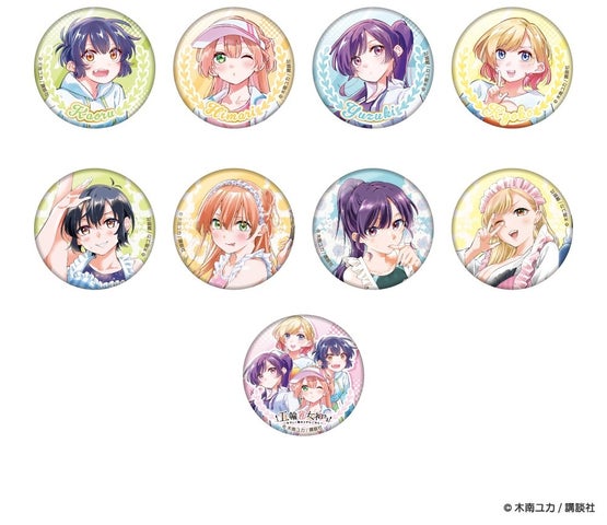 コミックの表紙イラストと描き下ろしイラストを使用した特別仕様のトレーディング缶バッジです。ホログラム加工がきらめき、ヒロインたちの魅力を引き立てます。どの絵柄が手に入るかは、開けてからのお楽しみです。9種セットには、描き下ろしイラストの4人が一つになった絵柄のセット特典が含まれます。