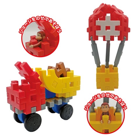 本商品は、おさるのジョージの物語に登場する「気球」や「トラック」、「別荘」などをブロックで組み立てることが可能です。腕が動くジョージのフィギュアが1体付属しており、組み立て遊びだけでなく、見立て遊びやごっこ遊びを通じて、より豊かな物語の世界を創造できます。お子さまの想像力を刺激し、ブロックで表現する楽しさを提供します。