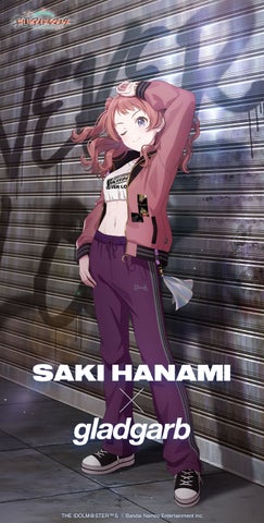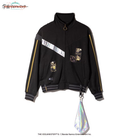 花海咲季の第一弾ソロ楽曲『Fighting My Way』の衣装コーディネートをスポーティなトラックジャケットに落とし込んだアイテムです。元アスリートという彼女のパーソナリティを表現し、手首やスカートの腰に見られる2本ラインをリブで再現。ヴィンテージスカーフを思わせるパッチワークで衣装のワッペンが再現されています。プリズム生地を用いたボディのラインは、オリジナルに見られる稲妻状の意匠をトラックジャケットらしくアレンジしたものです。特徴的な巻きスカートは取り外し可能なバンダナキーホルダーへとアレンジされ、細部にまでgladgarbらしい解釈が込められています。