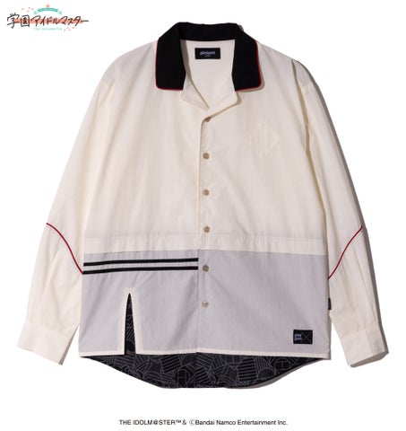 花海咲季のベーシックコスチュームを1枚のシャツへと再構築したアイテムです。上下で切り替えられたボディは、トップスを表現した部分にパイピングがあしらわれ、ボウリングシャツを思わせるストリートなムードを醸し出しています。ワッペンを模したパーツは敢えて無地であしらうことでモードな印象を付与。フェイクレイヤードしたスカート部分には、初星学園の校章をアレンジした柄が散りばめられ、作品へのリスペクトが表現されています。Pinkはオリジナルの配色、WhiteはSaki Blousonと合わせることで楽曲『初』における花海咲季の着こなしを再現するものとなっています。