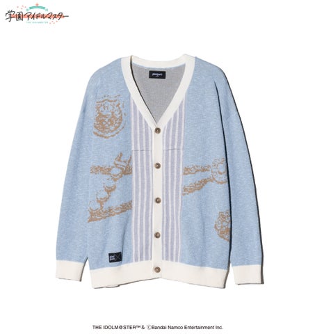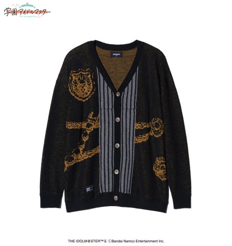 花海咲季の第二弾ソロ楽曲『Boom Boom Pow』の衣装をモチーフに編み上げられたVネックカーディガンです。ボディを彩るのは、彼女が着用するキャップに見られるエンブレムと要所に配されたジュエリーパーツのデザイン。これらは全面にジャカード編みで表現され、ストリートファッションへの解釈が込められています。前合わせにあたる部分はストライプ生地で切り替えられており、1枚で花海咲季の着こなしを再現するギミックが施されています。着丈と身幅にゆとりを持たせたルーズフィットで、リラックスとエレガンスが同居した佇まいを演出します。