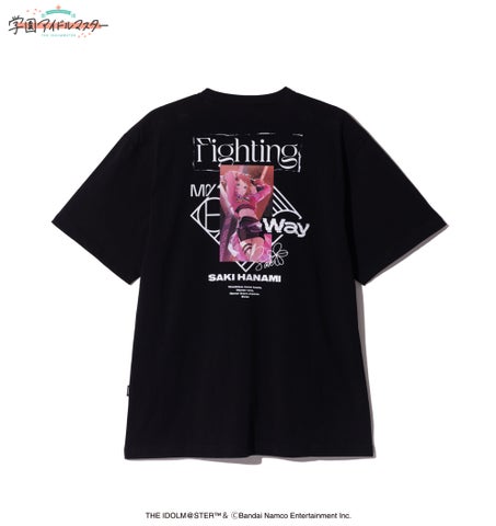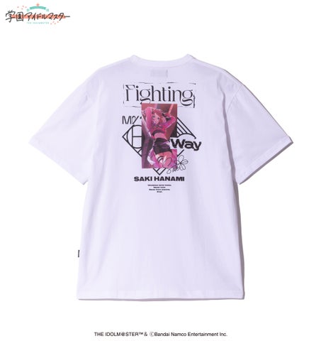 花海咲季をパンキッシュなコラージュアートに落とし込んだTシャツです。バックプリントには、第一弾ソロ楽曲『Fighting My Way』をモチーフとしたアートワークがアシッドグラフィックを思わせる構図で配され、花海咲季と楽曲のエッセンスが散りばめられています。フロント胸元には、花海咲季のレッスン着に見られるフレーズと彼女のパーソナリティを表すメッセージがコラージュされ、ロゴとしてストリートのムードを演出しています。