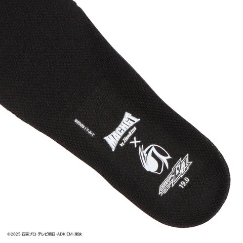 デザイン面では、アウトソールに近未来感を演出するクリアパーツを採用。アッパー部分には仮面ライダーゼッツをイメージしたメッシュ素材が使用され、細部にわたるこだわりが見られます。また、インソールにも仮面ライダーゼッツがプリントされており、履く際に靴の左右がわかりやすい仕様です。
