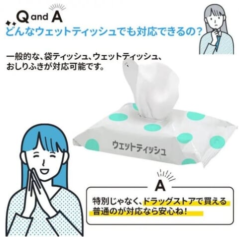 本製品は、一般的なウェットティッシュやおしりふきなどのケースとして活用できます。