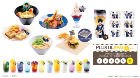 デクのワン・フォー・オールエビ勝丼、爆豪の発汗爆辛トマトガーリックパスタ、轟の半冷半燃パフェなど、フード・デザート全7種が展開されます。コラボメニューを注文すると、オリジナルコースターがランダムで1枚プレゼントされます。