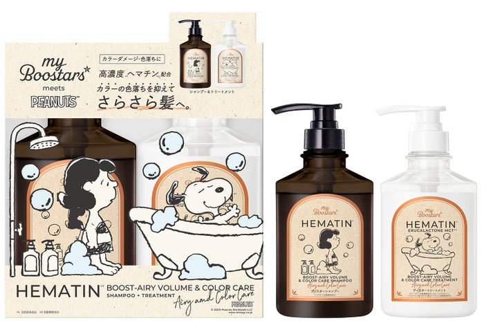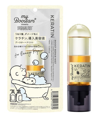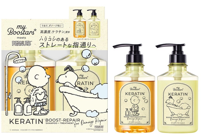 今回のコラボレーションでは、シャンプー&トリートメントセットとブースターミストに、PEANUTSのキャラクターをあしらった限定デザインが登場します。