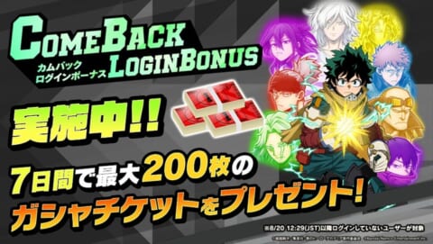 • 一定期間ログインしていないユーザーを対象に、7日間で合計200枚のガシャチケットが手に入ります。