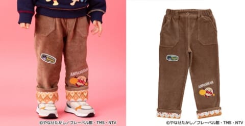 ノルディック柄の折り返しがおしゃれなニットコールパンツです。アンパンマンは刺繍で表現され、ばいきんまんのワッペンもアクセントになっています。裾折り返し仕様により丈の調節が可能で、お子様の成長に合わせて長く着用いただけます。