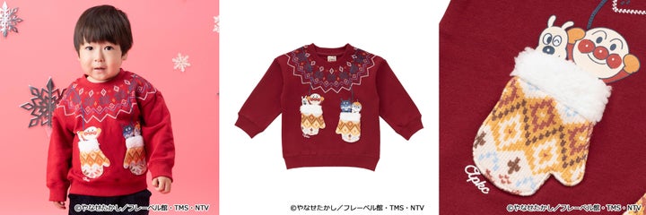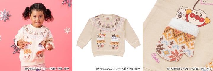 手袋からアンパンマンたちがひょっこり顔を出す、遊び心いっぱいのトレーナーです。ミトン部分はポケットになっており、紐部分は立体的な発泡プリントで表現されています。触りたくなるような可愛らしいデザインが特徴です。