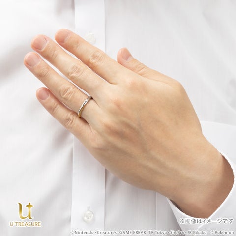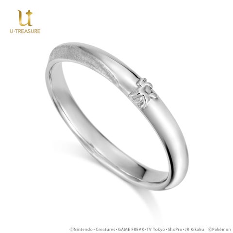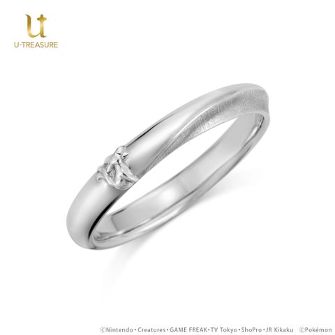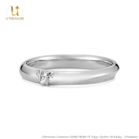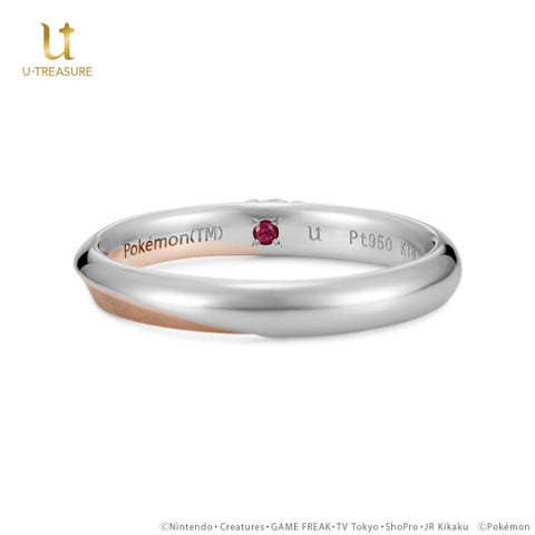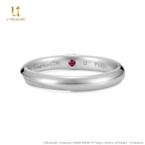 ストレートなラインにエーフィのシルエットが繊細にデザインされたリングです。エーフィが覚える技「あさのひざし」から着想を得た表のラインには、落ち着いた光を放つテクスチャが施されています。リングの内側には、情熱的なルビーが留められており、これから始まる新しい人生のスタートをポケモンと共に祝福するメッセージが込められています。