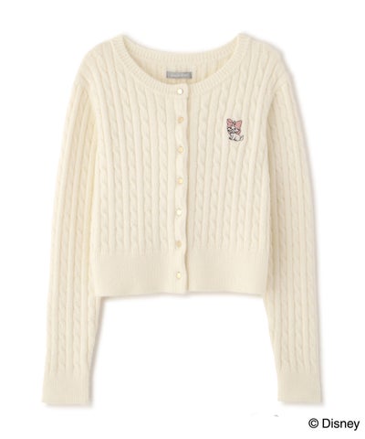 ショートシャギー糸を用いたふわふわのケーブル編みが特徴のカーディガンです。胸元にはマリーの刺繍が施され、マリーをイメージしたカラー展開にも注目が集まります。シャツとのレイヤードスタイルも推奨されており、可愛らしさの中に大人っぽい着こなしが提案されます。