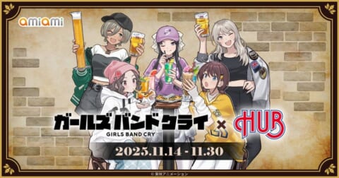 ホビー通販大手「あみあみ」は、人気アニメ『ガールズバンドクライ』と英国風PUB「HUB」とのコラボレーション企画を2025年11月14日より開催すると発表しました。限定メニューや特典、コラボ記念グッズの販売など、詳細が公開されています。