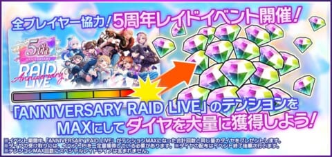 また、イベント期間中は全プレイヤー協力型の「ANNIVERSARY RAID LIVE」が開催され、テンションがMAXになった累計数に応じてダイヤが配布されます。イベントポイントの累計達成報酬である「ダイヤ交換券」を獲得したユーザーが対象となります。ダイヤの配布はイベント終了後です。