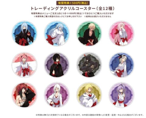 コラボメニューをご注文1点につき、有償特典として「トレーディングアクリルコースター(全12種)」を1つ500円(税込)でご購入いただけます。絵柄は選べない仕様です。