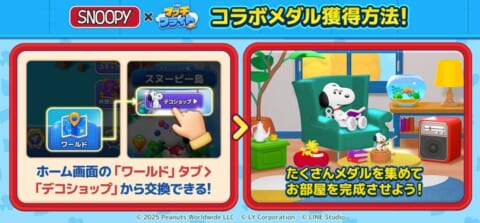 期間中、「スヌーピー島」を舞台に、ステージクリアなどのイベント報酬でコラボメダルを集めることができます。集めたメダルはデコショップにてコラボデコと交換可能です。全8種類のコラボデコを全て揃えることで、コラボオリジナルホームストーリーが完成します。