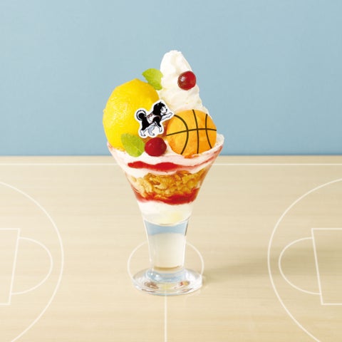 1,650円(税込) 誠凛高校のユニフォームカラーをイメージ。バスケットボールに見立てたオレンジシャーベット、テツヤ2号、リコのレモンのはちみつ漬けをイメージしたレアチーズムース、レモンの果肉入りジュレが特徴。 |