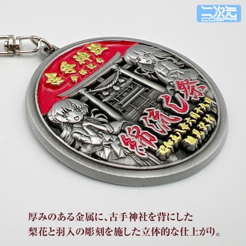 このキーホルダーは、古手神社を背にした梨花と羽入をモチーフにしたメタルキーホルダーです。立体感のある重厚な造形が特徴で、古美加工が施されており、レトロな雰囲気を醸し出しています。古美加工とは、金属製品に黒い色調を与えることで、アンティークやヴィンテージのような風合いを表現する加工方法です。商品ごとに表面処理に個体差が生じる点も、一つひとつのキーホルダーに個性をもたらします。