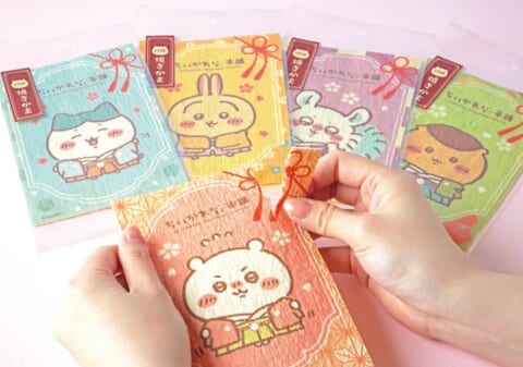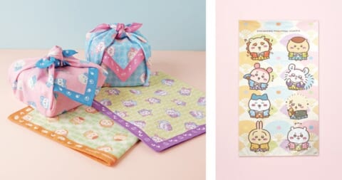 また、和装姿のちいかわたちがデザインされた「小風呂敷」全4種(各1,320円(税込))や「のれん」(3,850円(税込))が登場し、お部屋を彩ります。まるでポストカードのような可愛らしいデザインの「焼きかま」全5種(各350円(税込))も発売され、香ばしい風味が特徴です。こちらもオンラインストアでの取り扱いはありません。