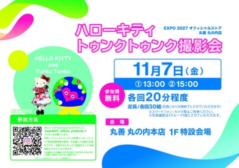 コラボレーション商品の発売を記念し、EXPO 2027 オフィシャルストア 丸善 丸の内店にて、「トゥンクトゥンク」と「ハローキティ」との3ショット写真撮影会が開催されます。本イベントは事前抽選予約制です。