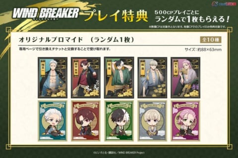 対象グッズのプレイ時、有償ポイント500CPご利用毎に「オリジナルブロマイド」が1枚ランダムでプレゼントされます。