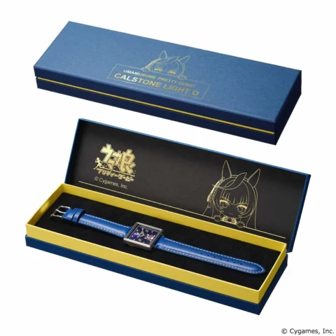 カルストンライトオをイメージしたスクエア型の腕時計です。直線の文字盤とバンドはブルーで統一され、裏地とステッチのイエローがアクセントになっています。インデックスもスクエア型で直線的なデザインです。秒針には、勝負服にデザインされた煌めく星のモチーフがあしらわれています。