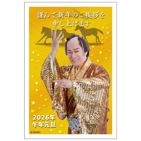 今年も大人気のマツケンが年賀状になって登場します。2026年はマツケン年賀状で、明るく楽しくゴージャスな新年のご挨拶が可能です。同一絵柄2枚入りで550円(税込)で販売されます。