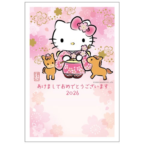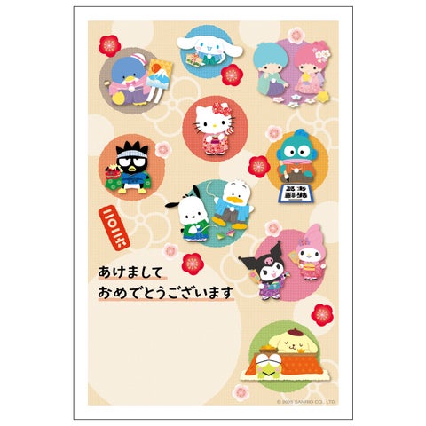 サンリオキャラクターがデザインされた年賀はがきです。同一絵柄2枚入りで各550円(税込)で販売されます。
